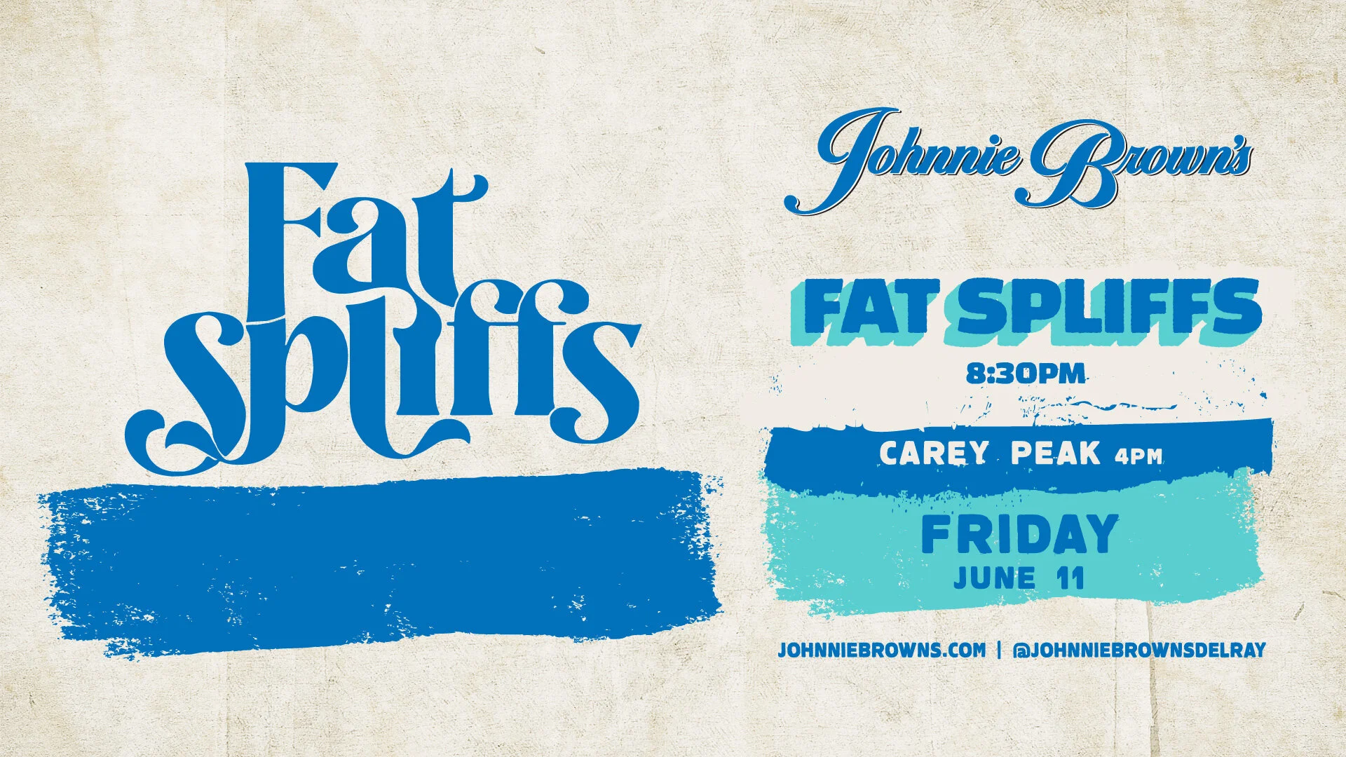 The Fat Spliffs are back on the Johnnie Brown’s Stage Friday, June 11th at 8:30 PM. Opening set by Carey Peak at 4 PM.
